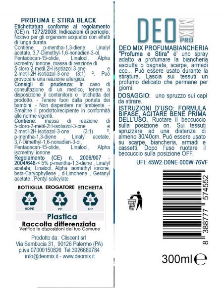 Deo Mix Casa Black è lo spray intenso e sensuale adatto a profumare il bucato asciutto o bagnato. Il profuma bucato